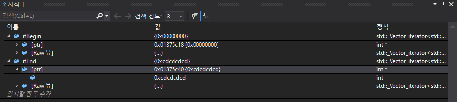 itBegin의 값은 처음 원소를 가리키는데 itEnd의 값은 엉뚱한 값을 가리키고 있는 것을 알 수 있습니다.